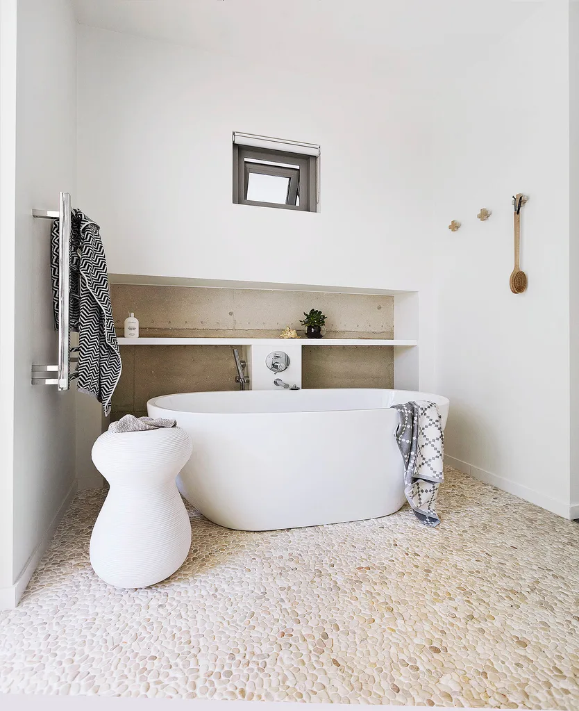 Made from river pebbles, the tactile floor tiles are a calming influence on the room. Bath and