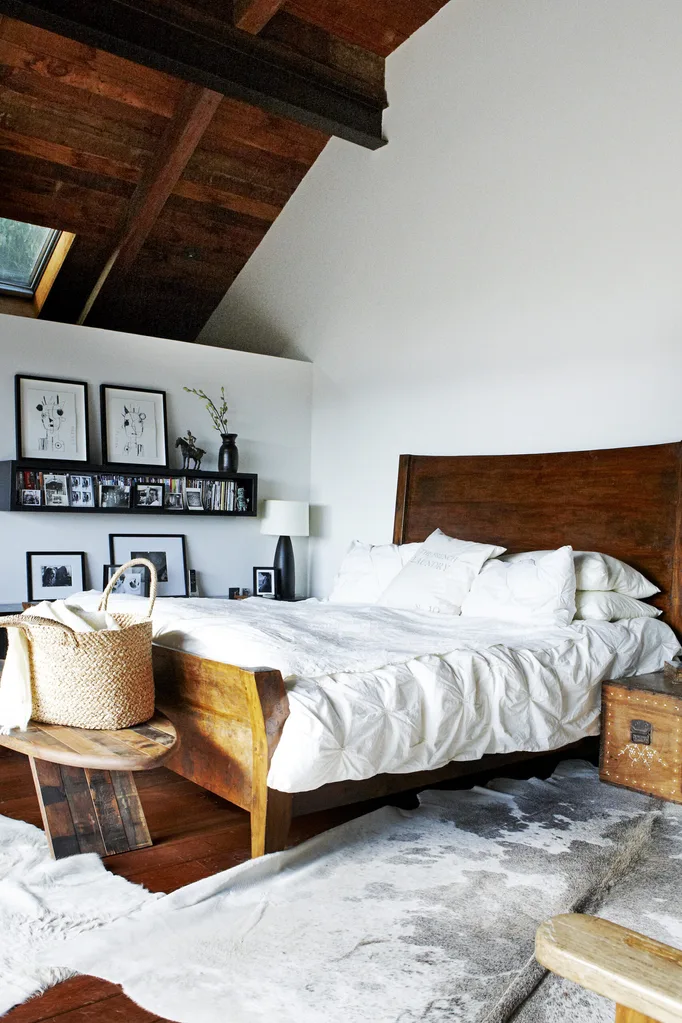 The master bedroom, with its comfy old sleigh bed, is tucked into the home’s loft next to a balcony that overlooks the pool.