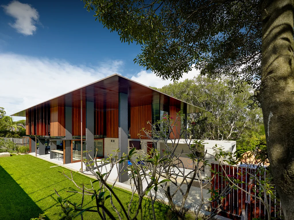 The pitched roof profile of the Land House in Mosman, and its timber shutters which allow for selective views.