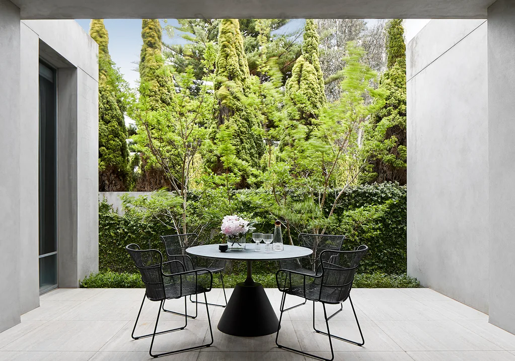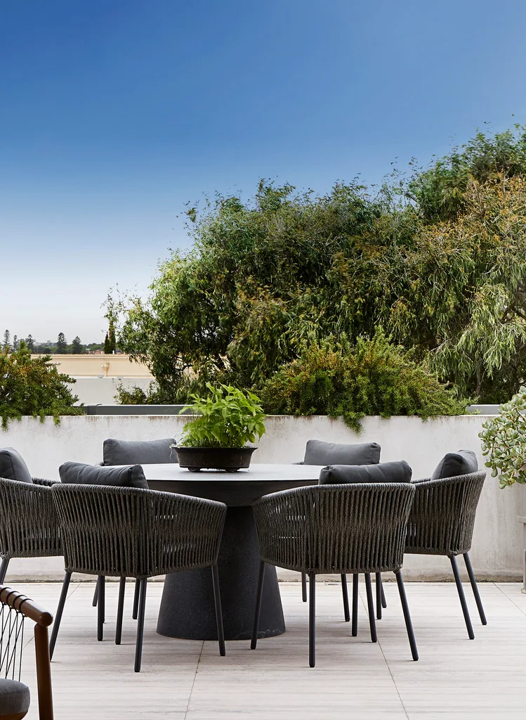 ‘Livorno’ round dining table from GlobeWest and ‘Catalina’ outdoor chairs from Coco Republic.