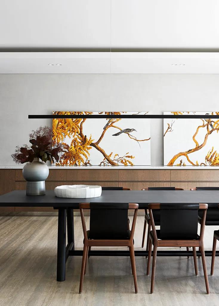Artworks by Lori Pensini from Gallerysmith light up the dining room. Custom table from Arranmore Furniture with ‘Pieman’ chairs by Tom Fereday from Dessein. Rina Menardi ‘Royal Queen’ ceramic vase and Paola Paronetto ‘Cartocci’ bowl, both from Fanuli.