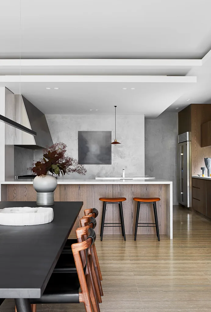 Set up for drinks and intimate dinners the ‘Club’ dining room on level one sports a kitchenette complete with cooktop, fridge and dishwasher. The owners’ table is ringed with ‘Cooper’ chairs from James Said on a rug from RC&D. Visual Comfort ‘Cleo’ pendant light by Kelly Wearstler. Ceramic bowls by Kristina Dam from In Good Company.