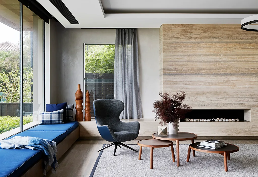 ‘Mad Joker’ armchair by Marcel Wanders from Poliform. Kendo ‘Van’ coffee tables from Ajar. Paper object from Domo and ‘Bowie’ vase by Sarah Ellison. Banquette upholstered in Zepel ‘UV Pro Outdoors’ fabric in Ink with cushions in Carlucci ‘Colzano’ from Unique Fabrics. ‘Zeus’ custom rug with leather border from Whitecliffe Imports.
