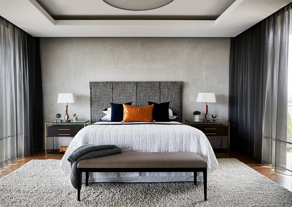 Bedhead custom made by New Image Upholstery in Zepel ‘Refract’ fabric in Graphite. Leather cushion from Established for Design. Flaxfield bed linen and cushions, all from Jennifer Button. ‘Curata’ bedside tables from James Said with Eichholtz ‘Olympia Equestrian’ table lamps from The Flying Fox. ‘Coral’ rug from Bayliss. ‘HC28 Earl’ bench from Domo with Bemboka wool blanket from Southwood Home.