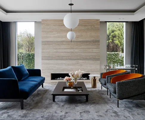 In a corner of the formal living room on a rug from RC&D, Minotti ‘Fil Noir’ armchairs from De De Ce and ‘Kendo’ coffee table from Natuzzi with a When Objects Work vase from Hub. DePadova ‘Elementi’ pendant light from Boffi Studio. ‘Rico’ brass and marble side table from Horgans. The impressive fireplace is made from travertine which complements the silver travertine flooring.