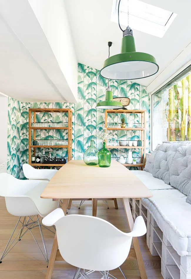 Natacha and Charles love the dining room’s outlook onto the garden and its banana palms, so they decided to continue the tropical feel indoors. They tracked down Cole & Son’s ‘Palm Jungle’ wallpaper, having seen a similar style while on holiday in Amsterdam. The vintage lights came from a local antiques fair.