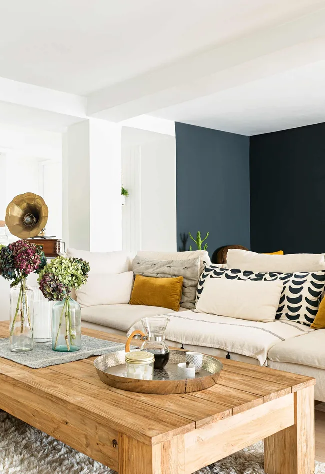 TIP: Paint one section of a space in a dark colour to add a striking dark feature wall – it will recede visually so your room seems larger, and create contrast and drama.