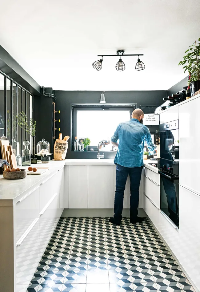 Handmade cement floor tiles featuring a three-dimensional cube pattern are the hero of the kitchen, with its smart scheme of crisp black and white. “I was slightly worried when Natacha asked me to buy black paint for the kitchen, but I must admit that I really like the result!” says Charles. The couple also opened up the kitchen with a glass window that looks onto the home’s entry.