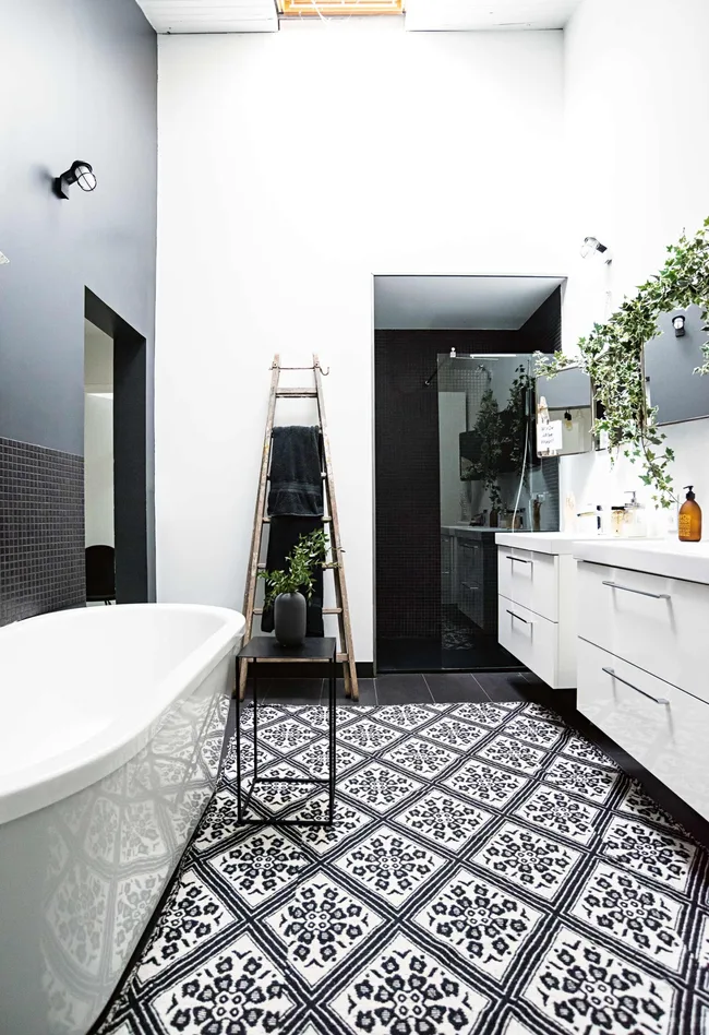 Natacha and Charles sacrificed one of the existing bedrooms to enlarge the family bathroom and included both a freestanding bath and walk-in shower. They also removed an attic space to increase the ceiling height and allow for a skylight. “The bathroom is a family room, where we spend a lot of time,” says Natacha.