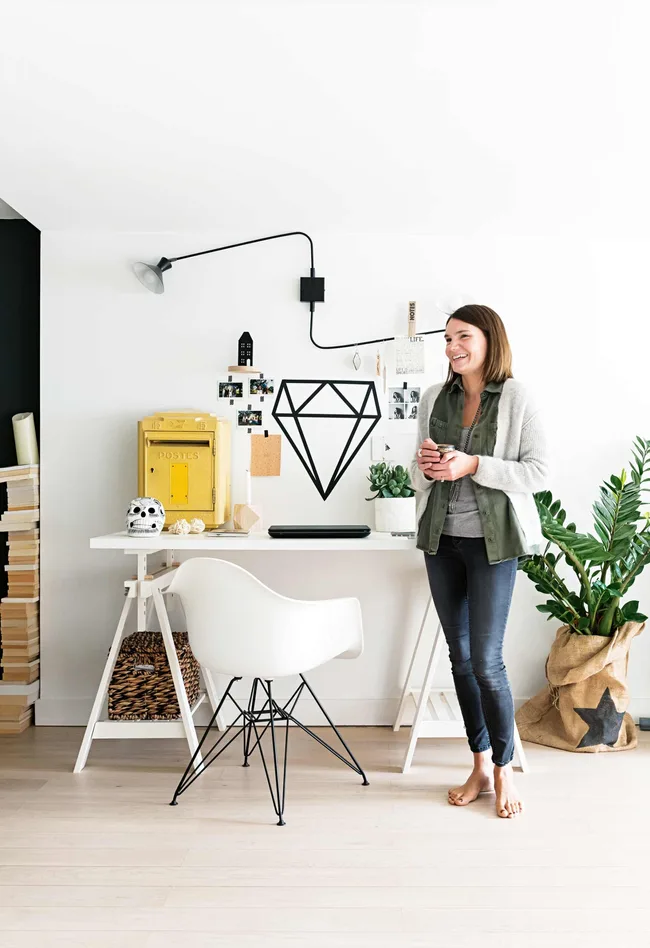 Natacha used a compact white office desk and desk chair in the hallway to create a portable and functional home office space. In her study nook, she has added dedicated task lighting and several accessories to add a personal touch.