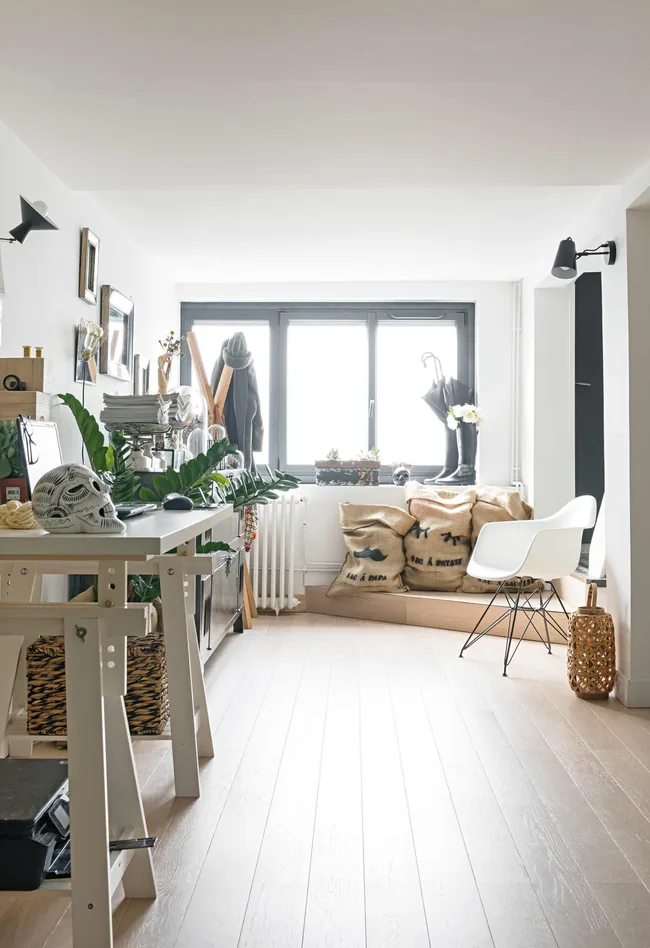 Just inside the house’s entry, potato sacks hold Lily and Mila’s toy collection. Natacha’s study area is set up on an IKEA trestle table, decorated with small artworks and vintage finds. “I like cultural and bohemian styles, as well as second-hand and rustic objects,” she says.