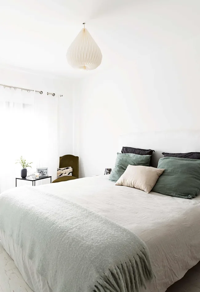 The bedroom is an oasis of calm, with white walls, pale timber flooring and a delicate lightshade. Comfort is key, with tactile layers in different shades of green softening the space and providing contrast. Sheer curtains are a perfect choice for a space where both natural light and privacy are important and a chair and table add extra relaxation space.