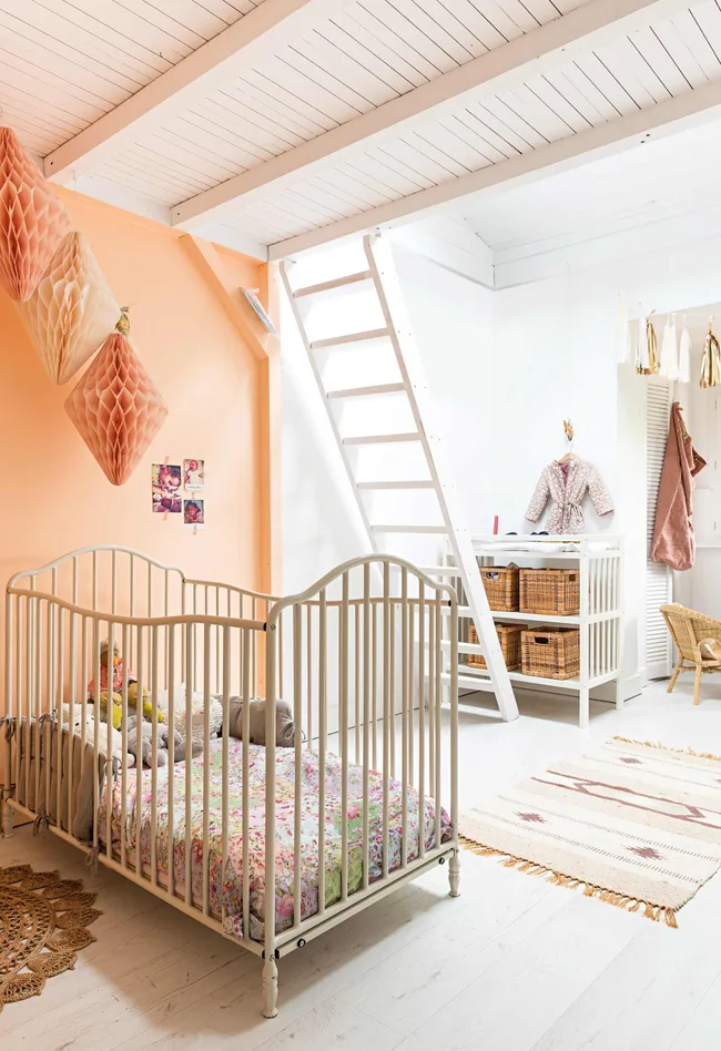 Little Mila’s bedroom is pretty in peach, with paper decorations matching the warm-toned wall. A collection of bird houses in varying sizes and colours hangs on one wall, with baskets and sacks providing plenty of toy storage.