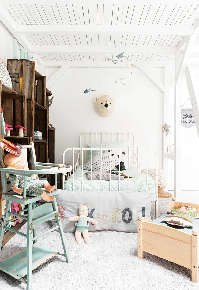 Lily’s sweet bedroom is a study in cute and quirky accessories, some housed on rustic wooden storage boxes purchased online. Lily’s dolls have their own vintage highchair and miniature bed, with an old-fashioned metal bedframe layered with soft cushions completing the space.