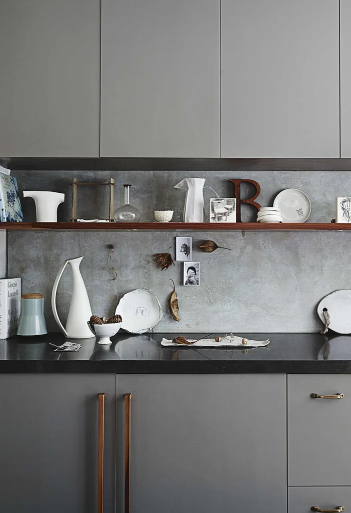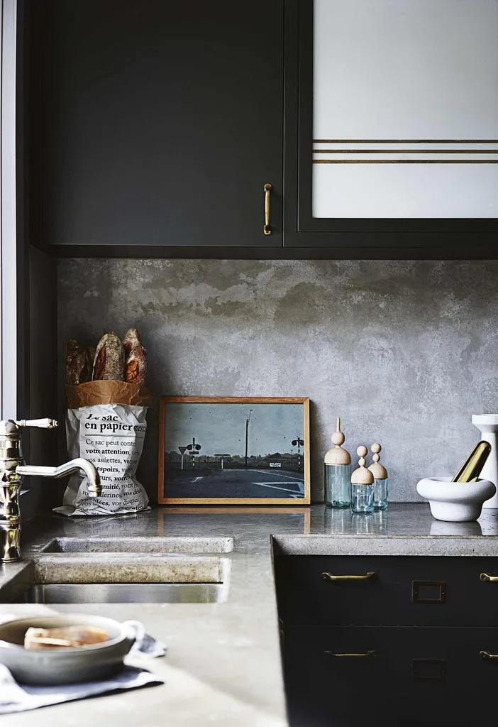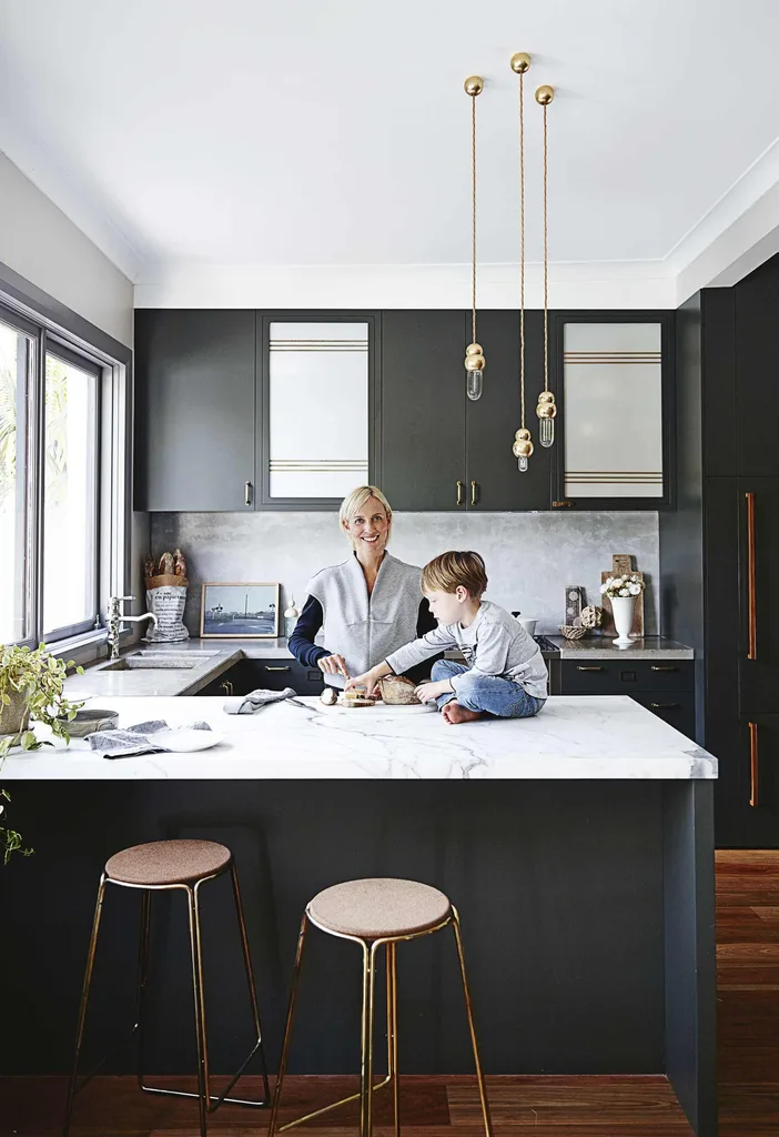 The splashback is also compressed cement, a budget buy from Bunnings Warehouse, and Claire took her colour cues from its mottled finish. “I felt the cabinets underneath needed some kind of colour with depth,” she says.