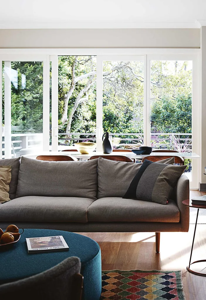 Living area The light-flooded space gets its colour inflections from a vintage Anatolian rug and deep topaz-toned ottoman from Jardan, creating a serene atmosphere that’s perfect for relaxation. The comfy ‘Nook’ sofa, also from Jardan, is James’ favourite place in the house.