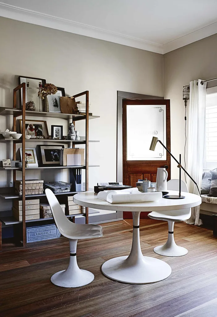 Office Claire’s workstation is a 1950s-era round table she found on eBay – a prime spot for meetings and editing fixtures and finishes for upcoming projects.