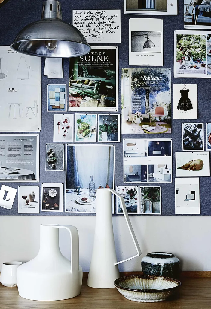 Office On one wall is a custom-built shelving unit from London company Benchmark where personal and business items meet; on another is Claire’s inspiration board where she pins up “anything I need to remember and anything that’s going to inspire”.