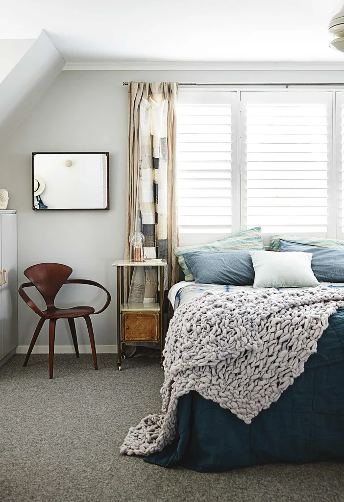 Master bedroom Cosy layers, including an Alison Fraser shibori throw from Small Spaces, dress the bed while a bare Fred International bulb light illuminates the vintage medical cabinet Claire uses as a bedside table.