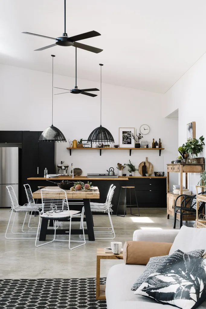 To keep costs down, Tanya and Duncan mixed designer items with budget finds. The kitchen is by Kaboodle Kitchen. The dining table — a Granada outdoor table from Globe West — was originally bought for the deck but Tanya preferred it indoors. Dining chairs and kitchen stools are from Kmart.