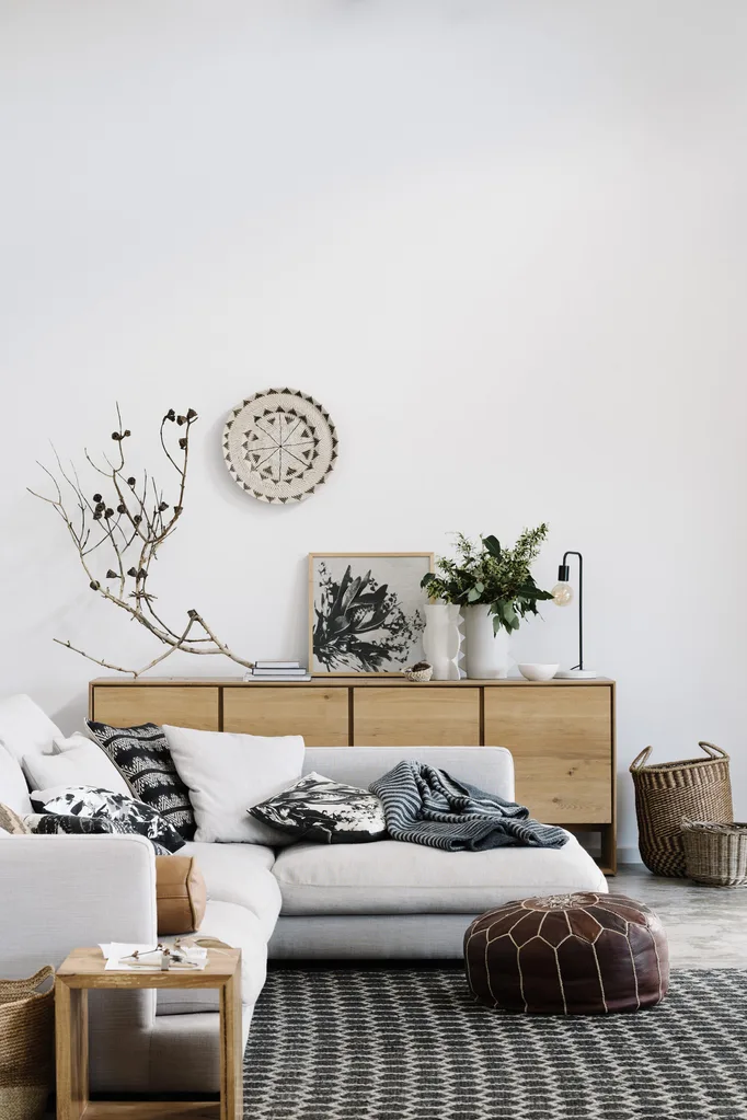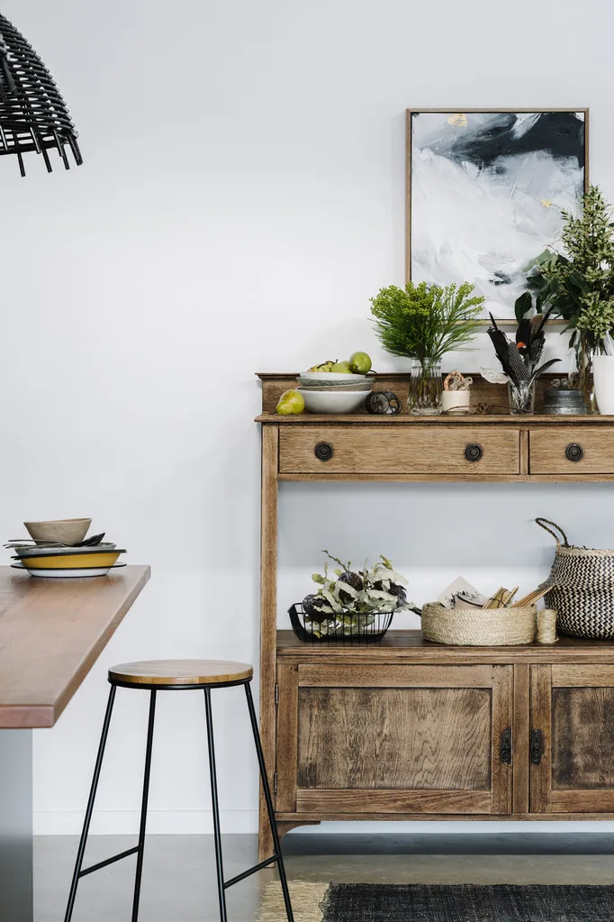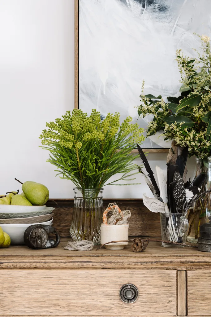 A branch of gumnuts forms a delicate sculptural piece atop the sideboard in the living space. The Ethnicraft buffet is from Globe West, and the lamp is from Kmart. The ottoman is from Table Tonic. All the cushions are by Tanya and the framed artwork on the sideboard is one of her tea towels framed.