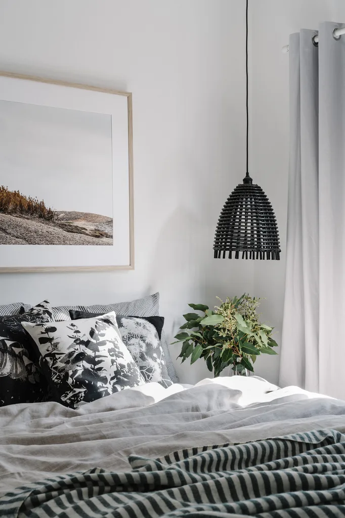 Inside, the home is decorated with creative flair. Designer pieces mingle with second-hand and thrifty purchases, while open shelving showcases artful arrangements. The colour palette is white, black, timber and ochre — “an earthy palette to match its location”, says Tanya.