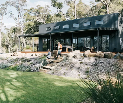 Tanya Cain-Abbs, her son Ollie, 12, and labradoodle Maisy love their home among the gum trees, in Yallingup, Western Australia. Tanya and her husband Duncan opted for a simple shed-style home, clad in Colorbond Monument so it nestles into the bush.