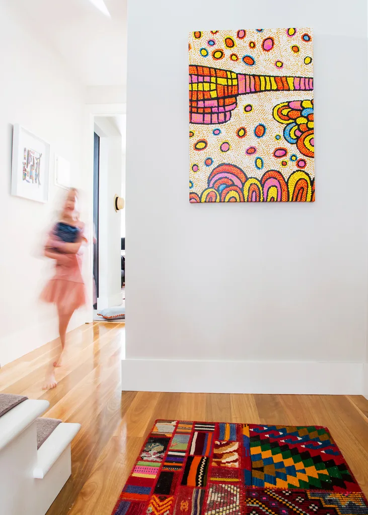 The hallway packs a punch with bold art and a rug in similar colours.