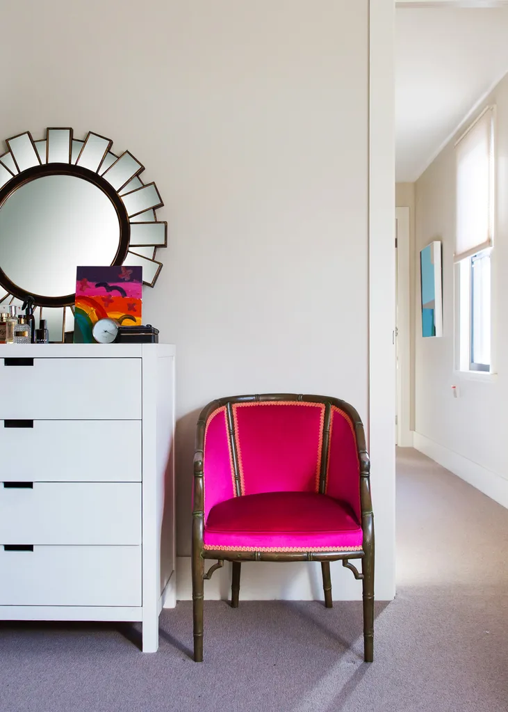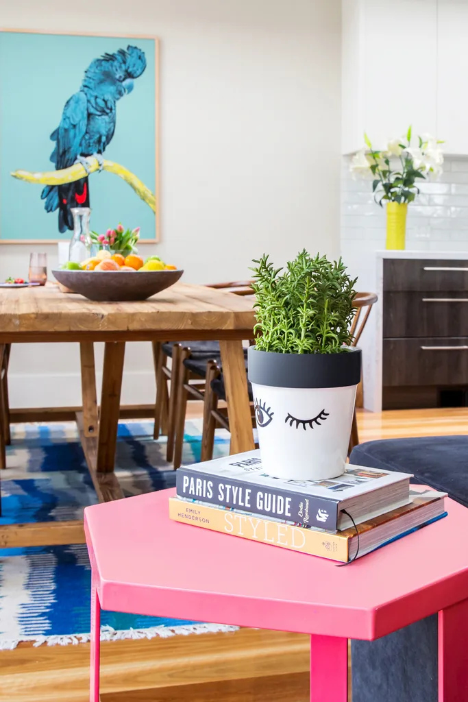 Pink, blue and yellow feature throughout the home. Pink side table from Freedom.
