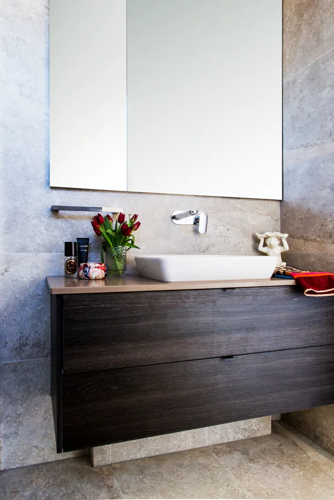 Mirrored cabinets provide extra storage in the ensuite bathroom.