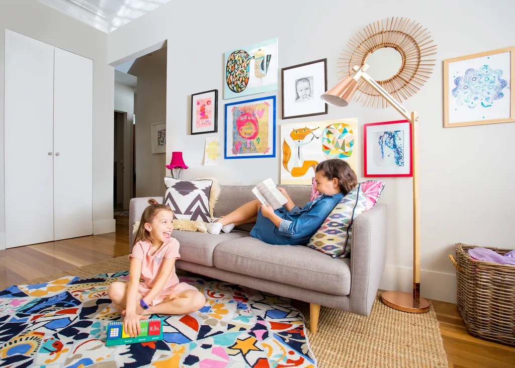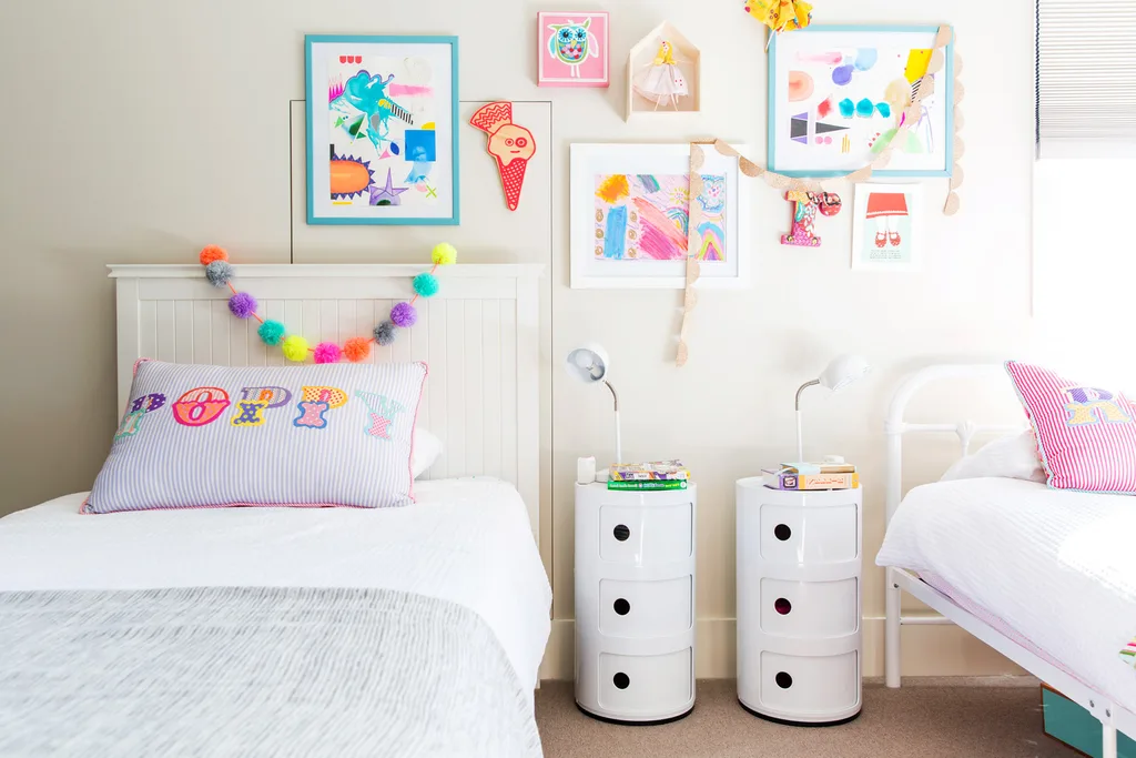 Artwork in the girls’ playroom features their own creations as well as Lucy’s.