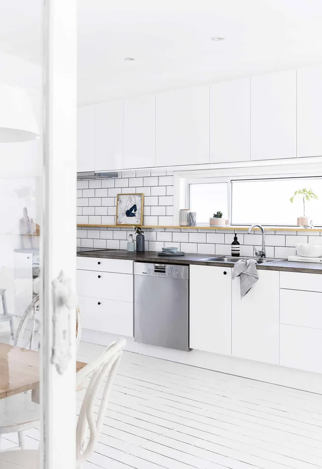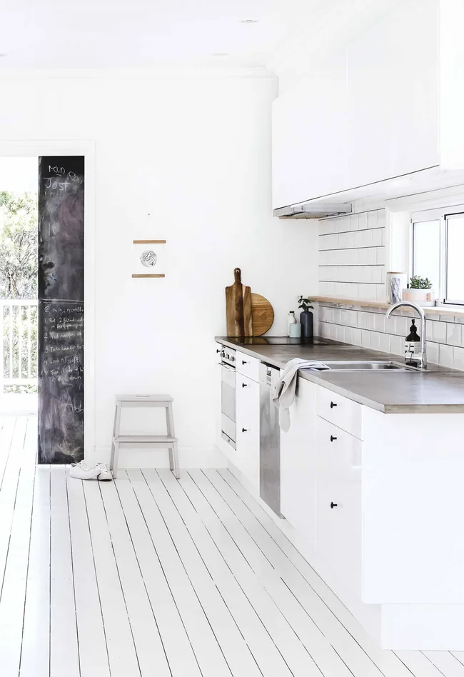 Kitchen The concrete bench and IKEA cabinetry are paired with white subway tiles from Bunnings. Artwork: Reflections by Marnie Mcknight.
