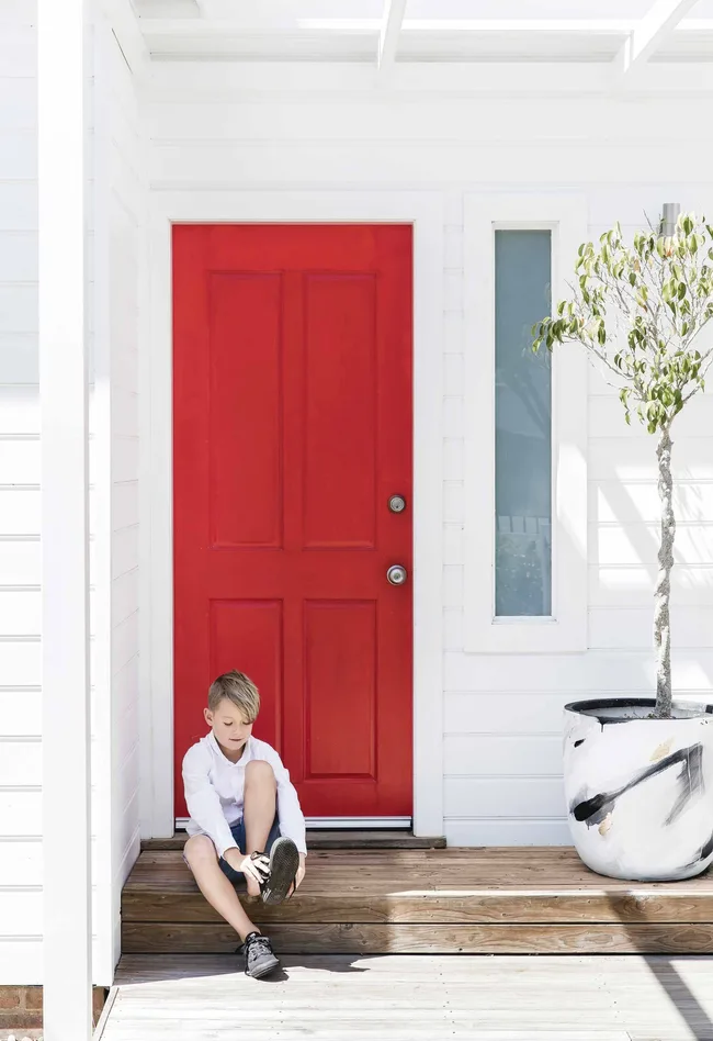 Exterior Cave sits on the steps in front of a door in bright Dulux ‘Super Enamel’ True Red paint.