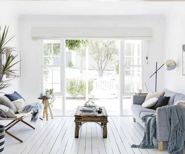 Living Room The IKEA sofa complements the stripped-back palette. “I love my coffee table,” says Marnie. “I found it on Gumtree for $5 and left it outside for two years so it could develop a weathered patina. I love how it turned out!”