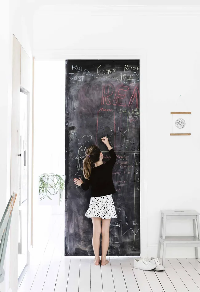 Blackboard Door Lulu draws on the sliding door, which separates the open-plan kitchen and dining space from the TV room.