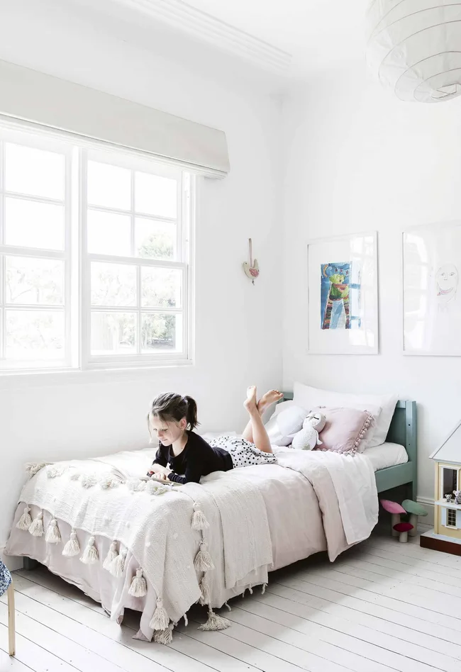 Girls’ Bedroom The beds were a set of black IKEA bunk beds, a bargain from eBay. “We reconfigured them into a single and toddler bed and painted them in Annie Sloan Duck Egg Blue,” says Marnie.