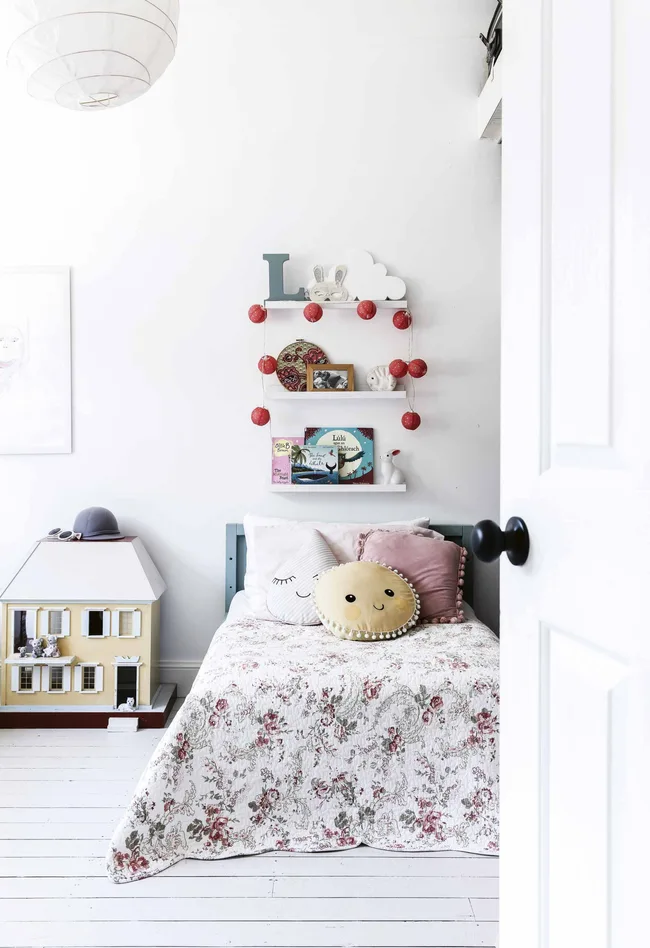 Girls’ Bedroom Pink tasselled cushions from Robin’s Nest Vintage in Miranda and a sunshine-yellow doll’s house are a feminine touch.