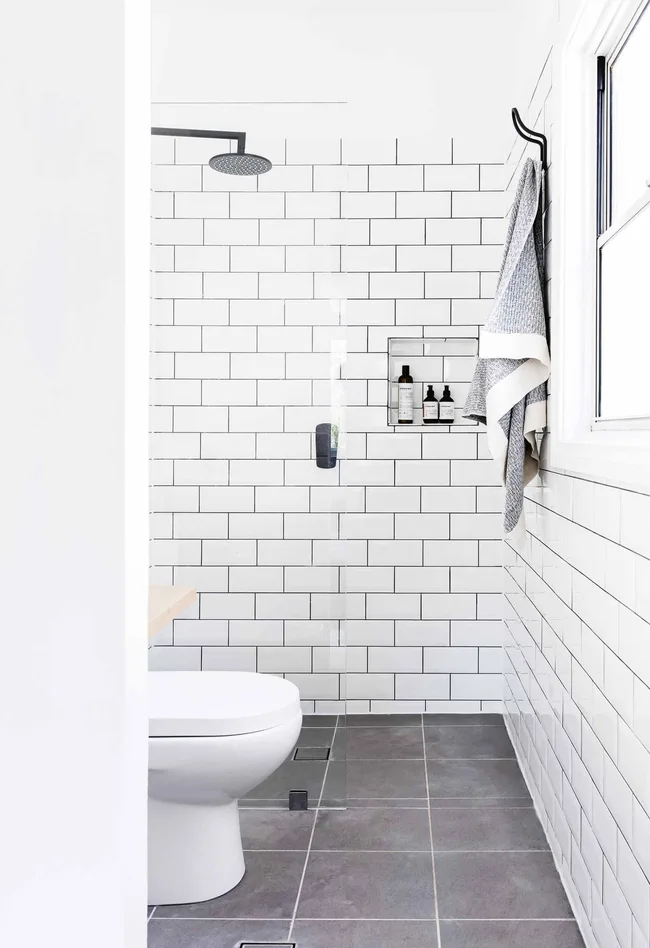 Ensuite White Bunnings subway tiles and ColorTile floor tiles give this space a peaceful look, while the walk-in shower is ideal in a smaller space. A Koskela bath towel adds softness.