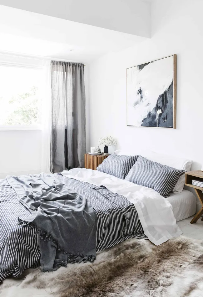 Master Bedroom One of the early pieces from Marnie’s Equinox collection hangs above the bed. Marnie made the curtains using ‘Aina’ linen from IKEA. The bed is dressed in Cultiver bedlinen and a throw from Atolyia.