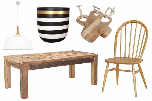 Old meets new Rustic timber and organic textures meet handmade pieces to create a stripped-back look. Get the look (clockwise from left) ‘Husk’ pendant light, $249, Beacon Lighting. ‘Stripe’ pot, from $140, Designtwins. ‘Puri’ boards, $69.95/set of 3, Provincial Home Living. Ercol ‘Windsor’ chair, $795, Temperature Design. ‘Anju’ coffee table, $499, Schots Home Emporium.