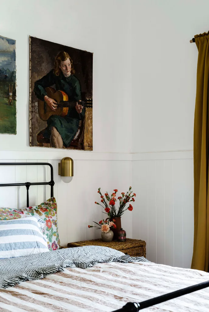 Emma and Matt’s bedroom has a collection of oil paintings above the bed. The bedding is from Society of Wanderers.
