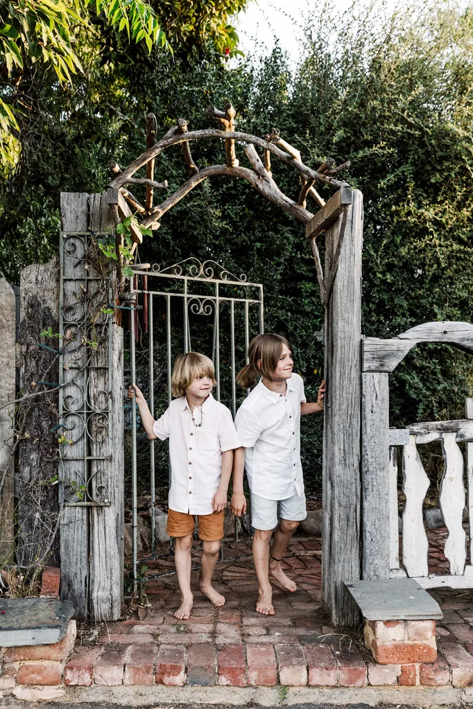 Abel and Reggie at the gate to the home. Matt, a keen gardener, created the fence from recycled timber.