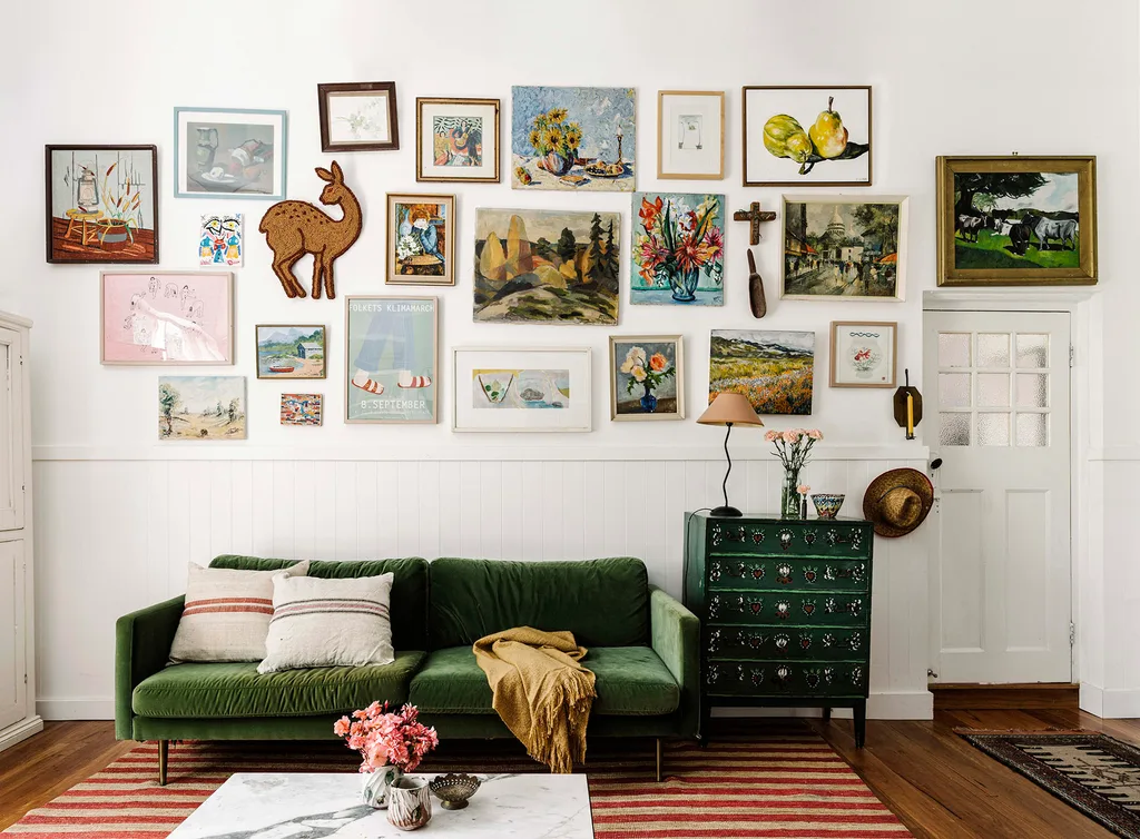 Matt Blatt’s Big Apple velvet sofa in emerald green sits below the gallery wall, which includes family artwork and pieces found on travels.