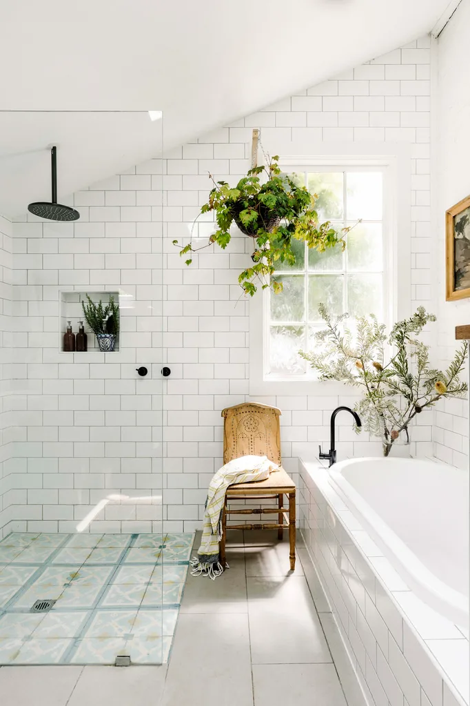 Emma likes to add greenery in the bathroom. The chair was found at an op shop for $5.