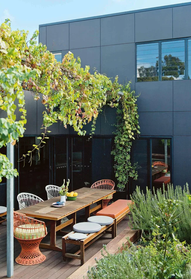 Courtyard The outdoor table and benches came from a local pub. “They were getting rid of them, so Paul gave them a sand and I got some cushions,” says Leonie.