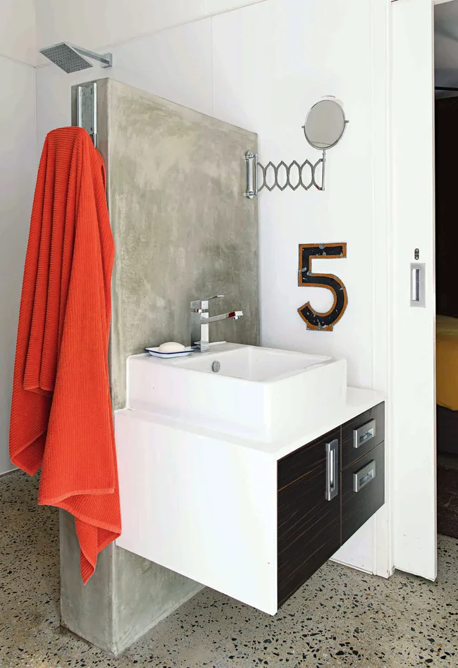 Bathroom Concrete blocks were used for the shower wall and kitchen island bench, which were then rendered in concrete. “It worked really well – people don’t realise it’s not poured concrete, which was more expensive,” says Leonie.”I don’t want to clean tiles and glass showerscreens.”