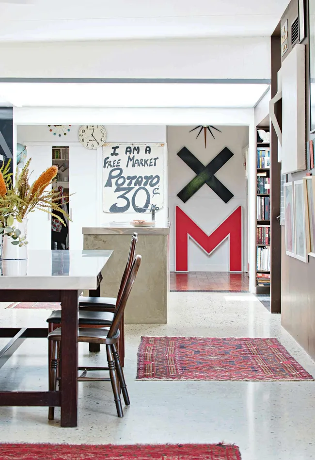 Previously living in a warehouse they’d renovated in the centre of town, the couple were attracted to the single-storey house as it only needed a cosmetic makeover and had a space that artist Leonie could use as a studio.
