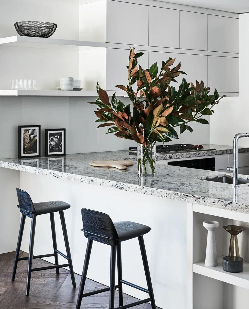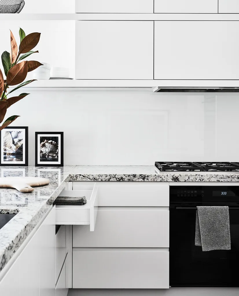 Blum soft-close drawers add quiet luxury. Artworks by Caitlin Mills from Safari Living.