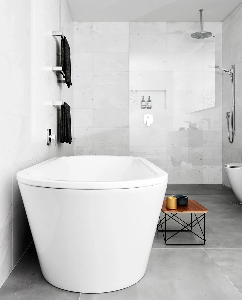 Kaldewei ‘Vaio’ freestanding bath. Eames wire base table from Living Edge.