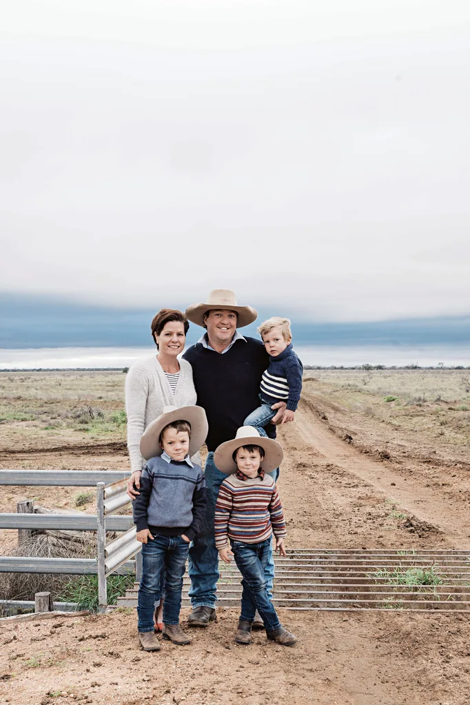 Jayde and Ben Chandler (holding two-year-old Wally) with Jack, five, and Charlie, four, on their 7000-hectare cattle property in western Queensland.